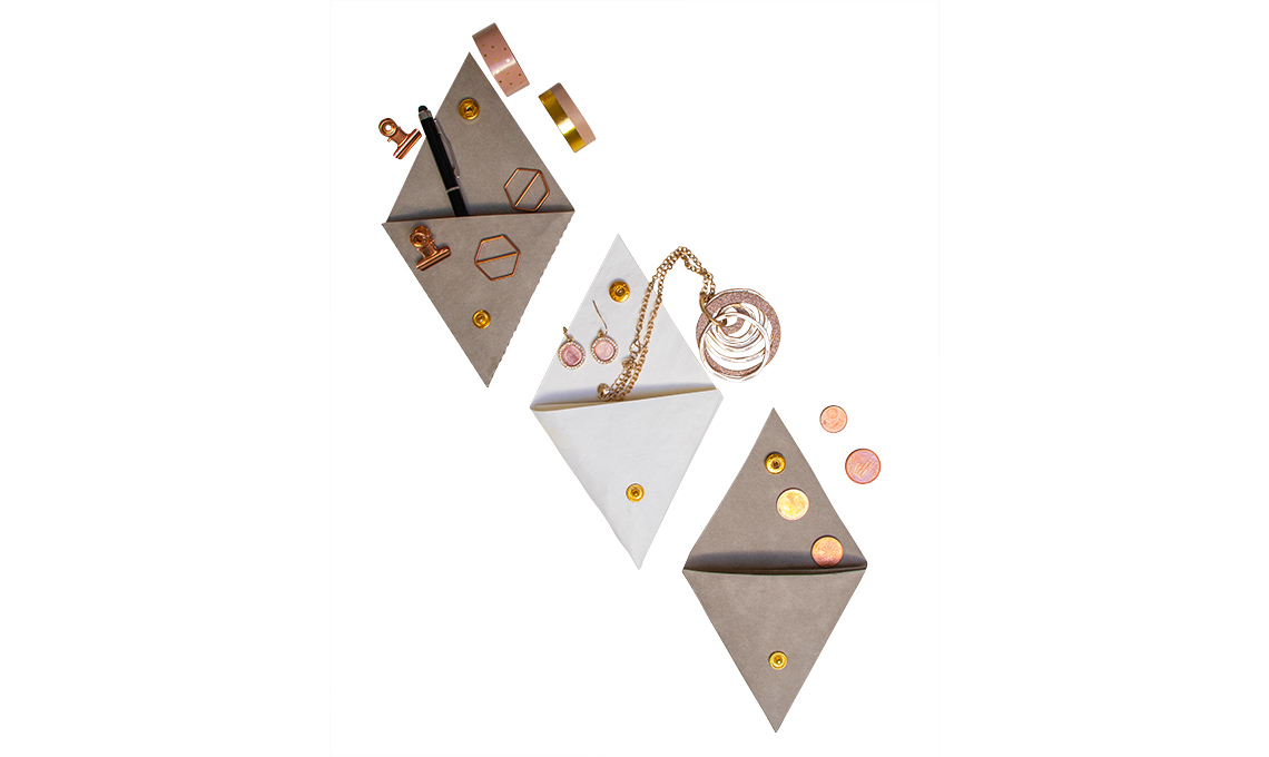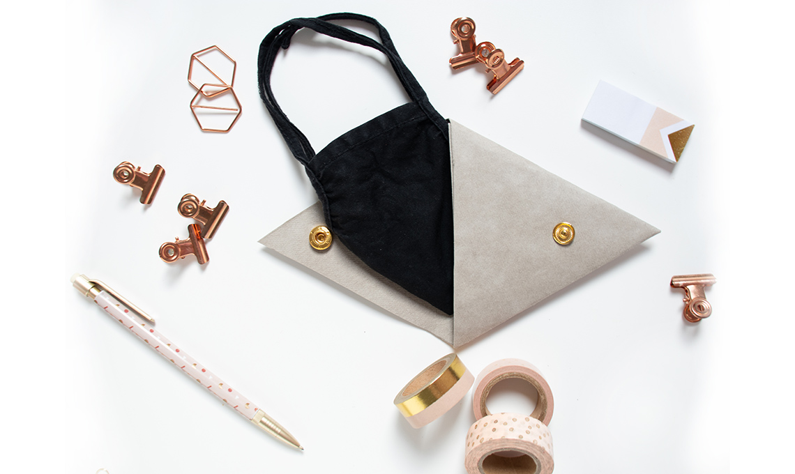 - Seguendo il template ritaglia nella pelle vegana la sagoma: con un foglio A4 potrai fare 2 bustine. Prendi un lato corto e ripiegalo su quello lungo, incollando poi i bordi. Con una mollettina tieni uniti i due lembi fino a che non saranno incollati. In alternativa cuci, anche utilizzando la macchina per cucire, i due lati.