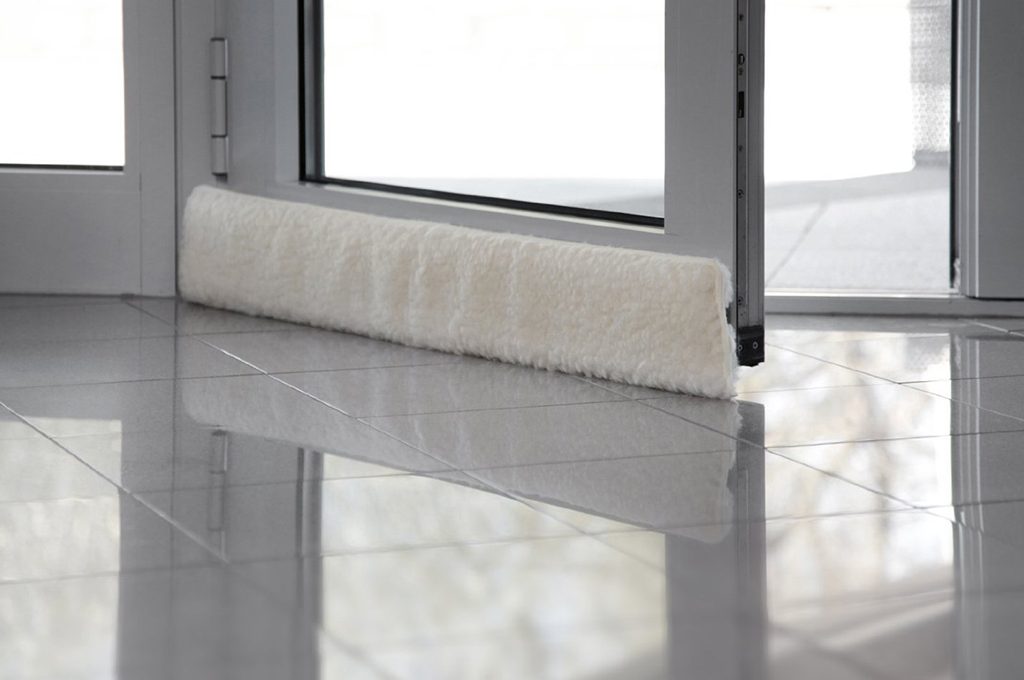 Mai più tagli d’aria a pavimento con i paraspifferi in pura lana vergine lavabile, applicabili e rimovibili con velcro alla base di ante a battente [Schurwoll, cm 100x1,5x6h €22,40].