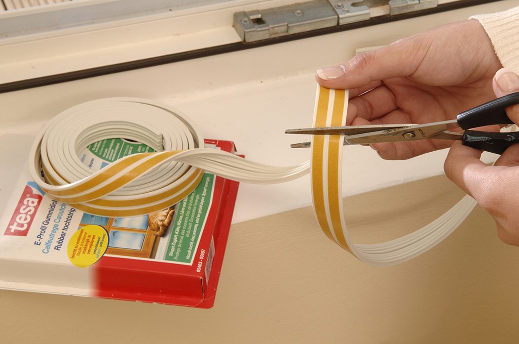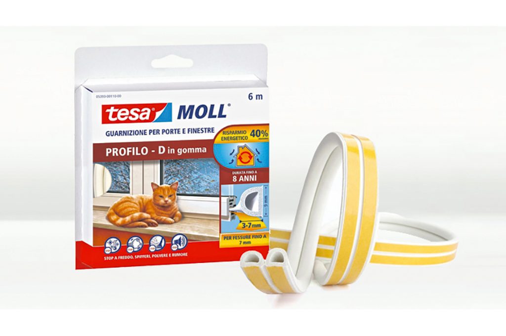 Per le finestre: guarnizione autoadesiva termoplastica come Tesamoll® Profilo D di Tesa, che può essere adattata a fessure da 3 a 7 mm e resiste alle intemperie e ai raggi UV. Dura fino a 8 anni [Tesa].
