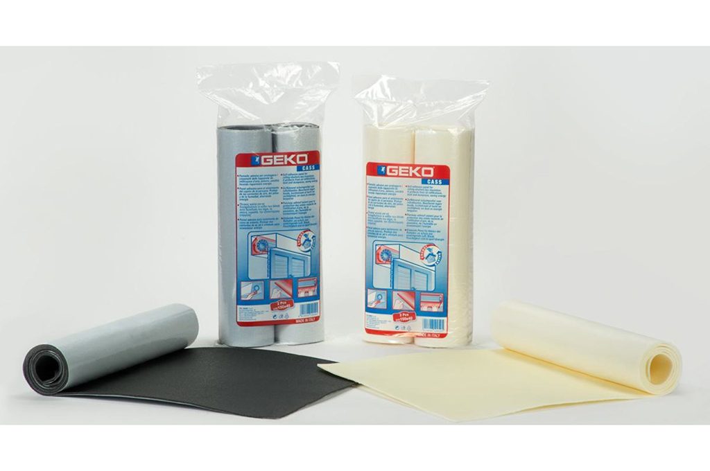Per proteggere i cassonetti da dispersioni di calore e infiltrazioni d’aria si rivestono accuratamente i lati interni con i fogli isolanti in resina di polietilene adesivo, come Geko Cass Art. 2.400 [Tre Emme].