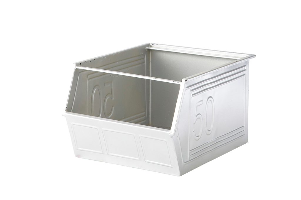 Cassette industriali di metallo impilate e fissate possono dare vita a una soluzione storage per avere tutti i materiali e gli attrezzi sempre a portata di mano.