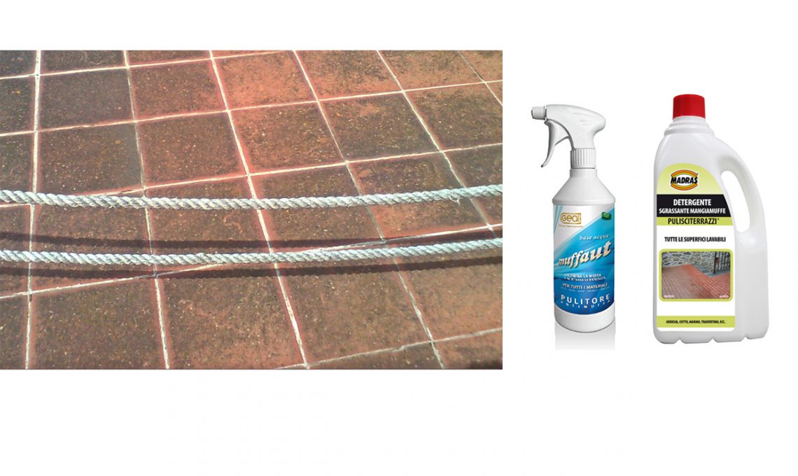 Pulisciterrazzi® è uno sgrassante mangiamuffe [New Madras, prezzo su richiesta]. Muffaut elimina ogni muffa e ne ritarda la formazione [Geal €8,40/750 ml].