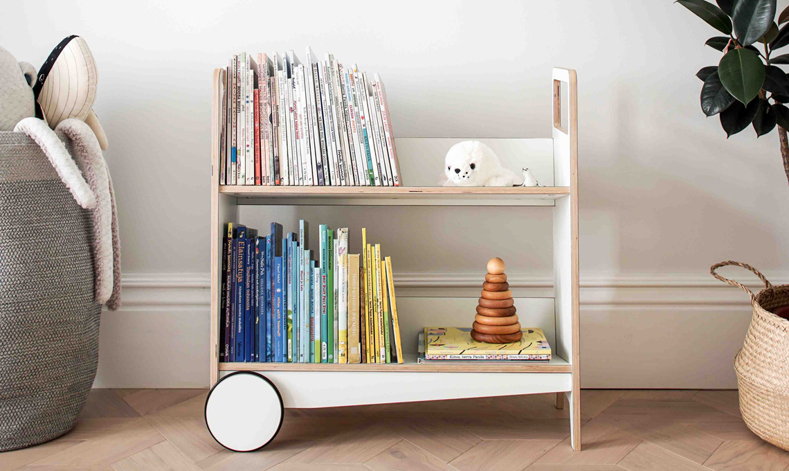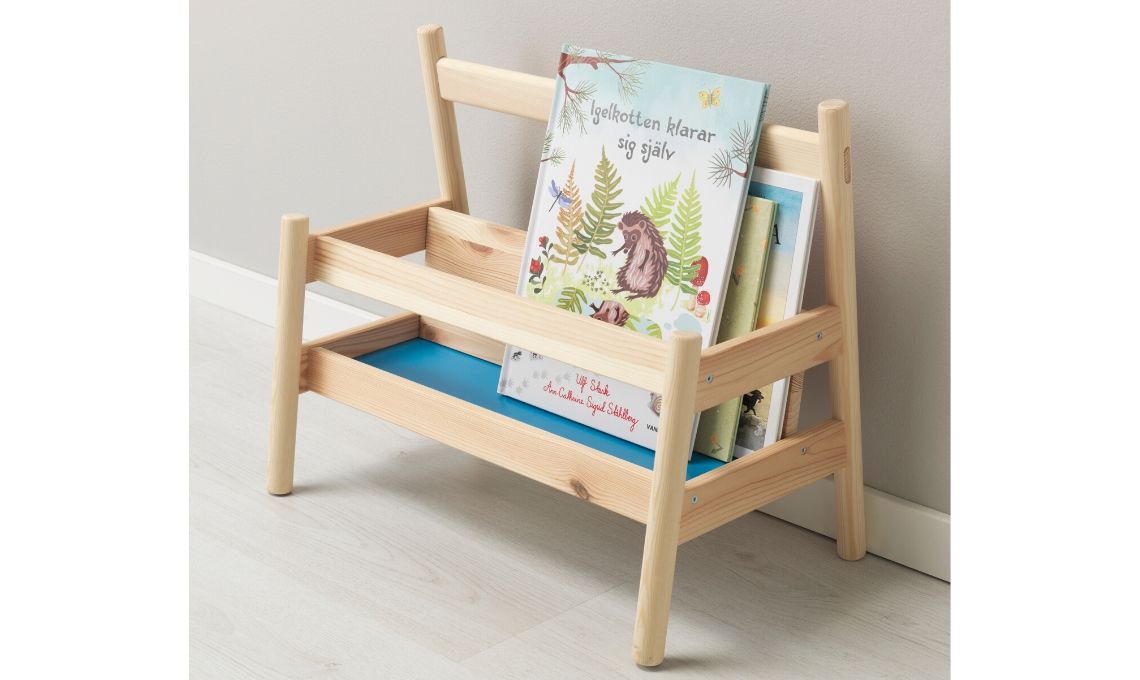 Espositore per libri Flisat. In pino massiccio, aiuta i bambini a riconoscere e scegliere i libri in autonomia perché le copertine sono in vista [Ikea, €20].