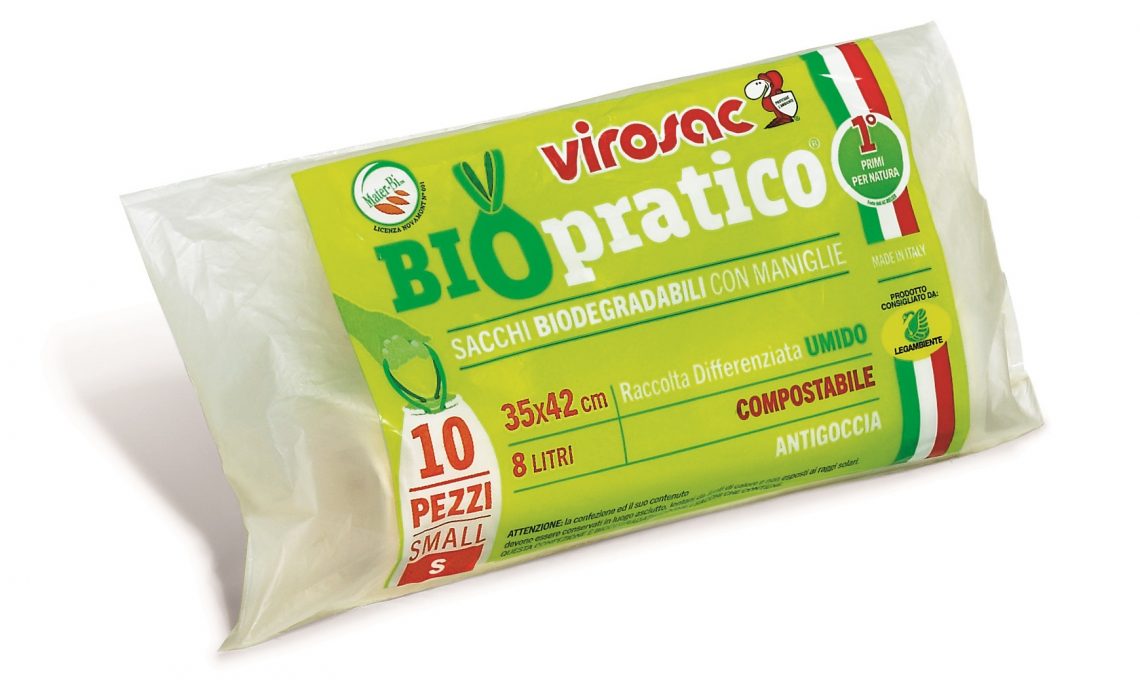 Una novità al supermercatoBiopratico Virosac è il sacco per il rifiuto umido più venduto in Italia (dati Nielsen): materiale di qualità, saldatura laterale antigoccia e produzione rigorosamente Made in Italy. Per adattarsi alle piccole pattumiere moderne Virosac ha da poco lanciato il nuovo formato S (Small) da cm 35x42. Biopratico ha un sistema con maniglie: in questo modo risulta più capiente, si riempie del tutto e poi si chiude e si trasporta con facilità.