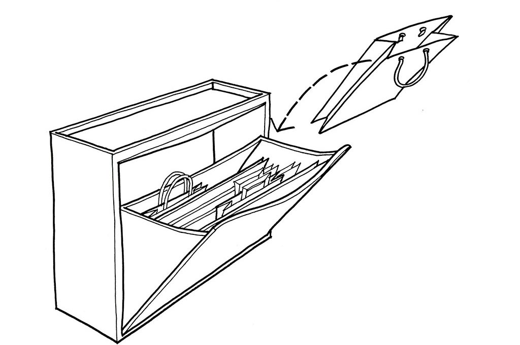 Guardati in giro con calma: spesso la soluzione più pratica è davanti ai tuoi occhi, basta inventare nuove funzioni per oggetti già in uso. Per esempio, le scarpiere a ribata [come Trones di Ikea] possono contenere anche le buste rigide, appiattite e ripiegate. diventano un pratico dispenser!