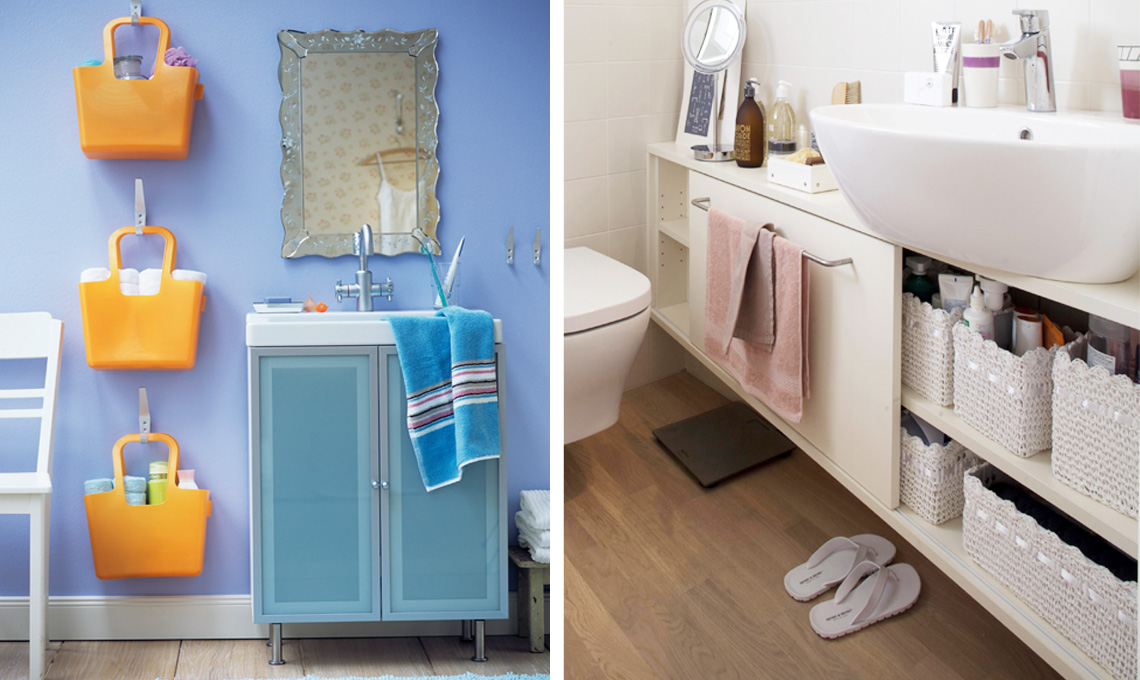 Altre ispirazioni per utilizzare in modo ordinato cestini e contenitori [a sinistra: foto Vega MG; a destra: foto Giandomenico Frassi, styling Vanessa Pisk]