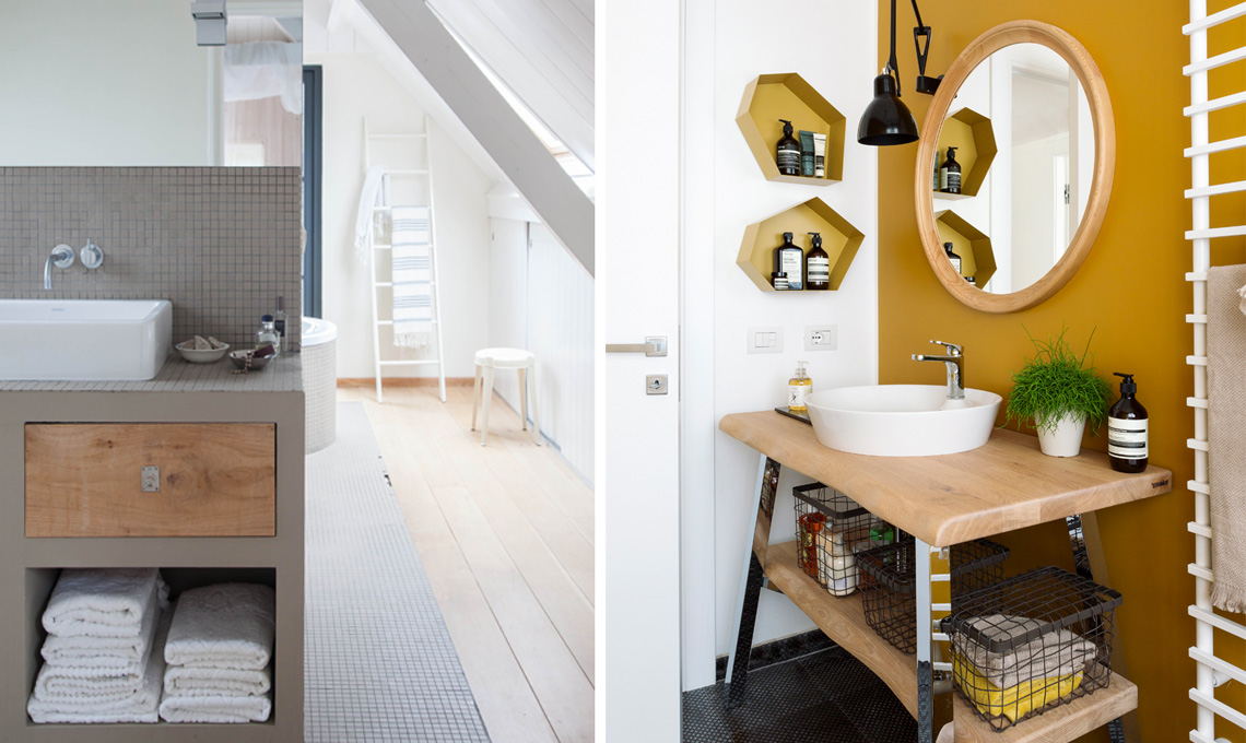 Usa piccole mensole accanto al lavabo per posizionare solo lo stretto necessario, come sapone, spazzolino e dentifricio: il resto può essere sistemato nell'armadietto. Lascerai così le superfici in ceramica il più possibile libere, per facilitare le pulizie.