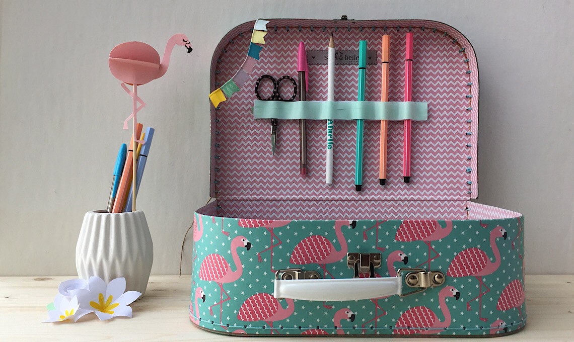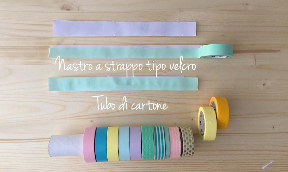 - Potete usare una valigia di carta organizzando, con del materiale di riciclo, il suo interno. Nel mio progetto ho utilizzato del nastro a strappo adesivo di velcro decorato con washi tape per raccogliere penne, pennarelli e un paio di forbici. Ho posizionato il velcro sull’apertura interna della valigia. Ho poi utilizzato un tubo di cartone riciclato per raccogliere i tanti washi tape colorati.