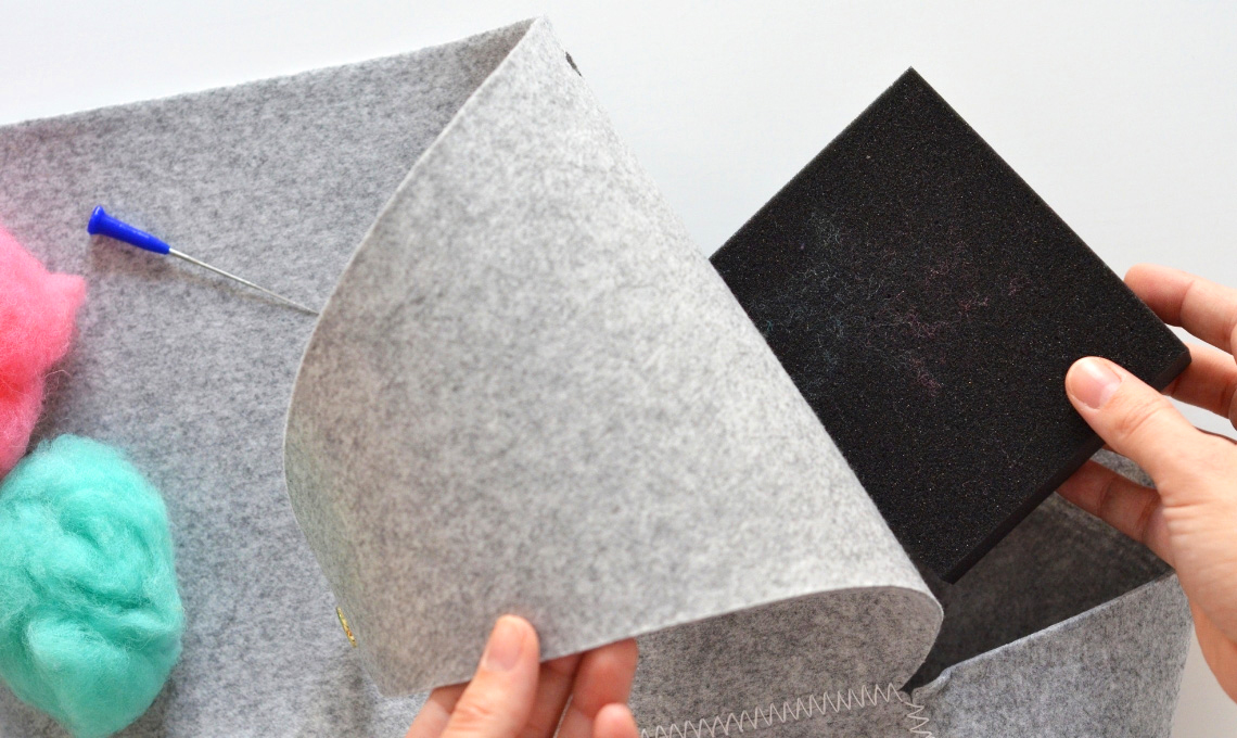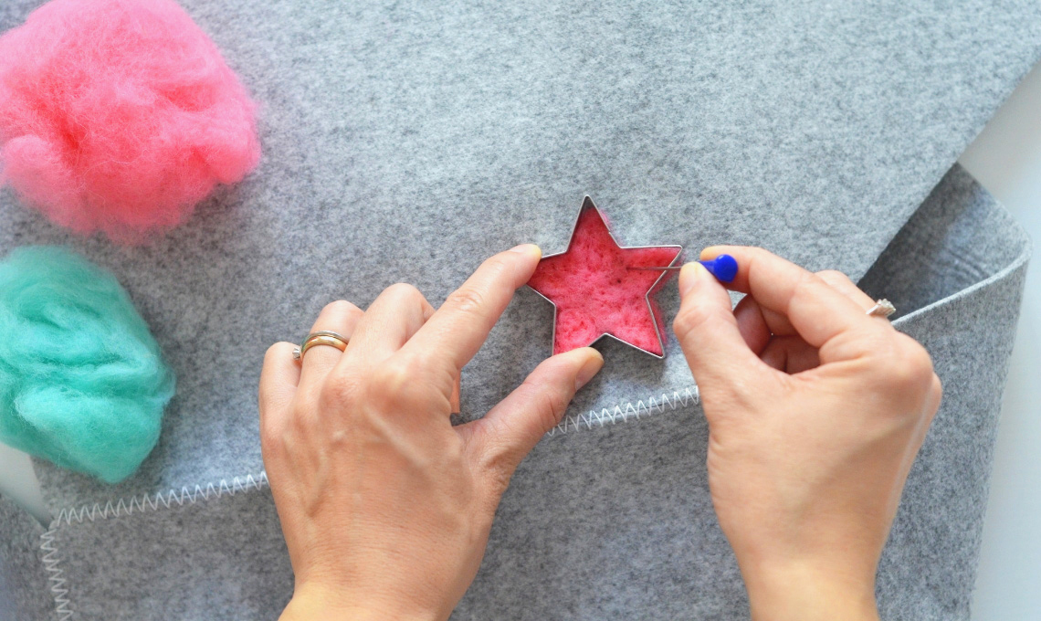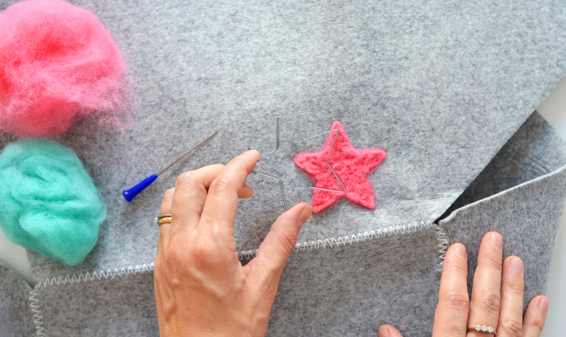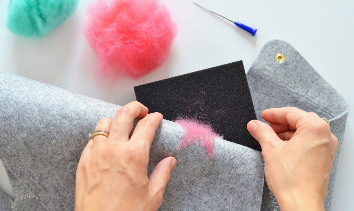 - Rimuovete ora la formina metallica e la spugnetta sul retro. La decorazione è terminata e, grazie allo speciale ago dotato di minuscoli uncini, resterà per sempre fissata al tessuto, anche dopo il lavaggio. Anzi, l’acqua completerà l’azione di infeltrimento e renderà ancora più bello l’effetto finale!
