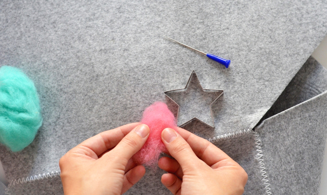 - Ora è il momento della parte più divertente: picchiettate velocemente con l’ago per infeltrire, aggiungendo poco alla volta nuova lana fino a riempire tutta la superficie della formina metallica. Per un risultato ottimale, cercate di realizzare uno strato di lana uniforme di circa 2 mm e fate attenzione a delineare con precisione i contorni della forma, soprattutto angoli e piccoli dettagli.
