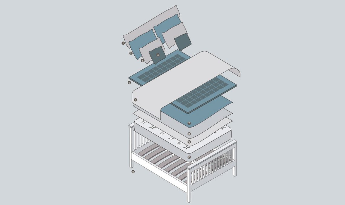 1. Cuscino lungo, rettangolare o a rullo (cm 130-160) 2. Guanciali grandi da cm 80x50 (misura standard italiana) 3. Guanciali ‘Oxford’ da cm 51x71 (misura standard europea) 4. Cuscino decorativo ‘Boudoir’ (cm 40x30) 5. Trapunta 6. Copriletto 7. Lenzuolo di sopra 8. Lenzuolo di sotto 9. Coprimaterasso 10. Materasso 11. Struttura