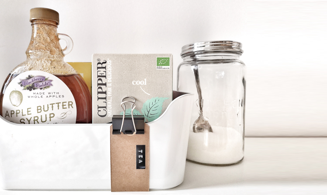 Piccoli cambiamenti possono fare una grande differenza e in realtà risparmiare un sacco di tempo. Se tutto ha un posto o almeno una zona, significa meno tempo impiegato per 'cercare le cose' e inoltre è meno probabile acquistare multipli di qualsiasi cosa perché puoi vedere ciò che hai già.