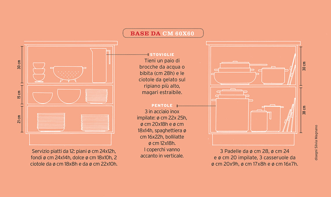 Puoi organizzarla con piatti e stoviglie oppure pentole. Per la prima opzione sistemali così: servizio piatti da 12 con piani ø cm 24x12h, fondi ø cm 24x14h, dolce ø cm 18x10h, 2 ciotole da ø cm 18x8h e da ø cm 22x10h. Trovi posto anche per le stoviglie: tieni un paio di brocche da acqua o bibita (cm 28h) e le ciotole da gelato sul ripiano più alto, magari estraibile.