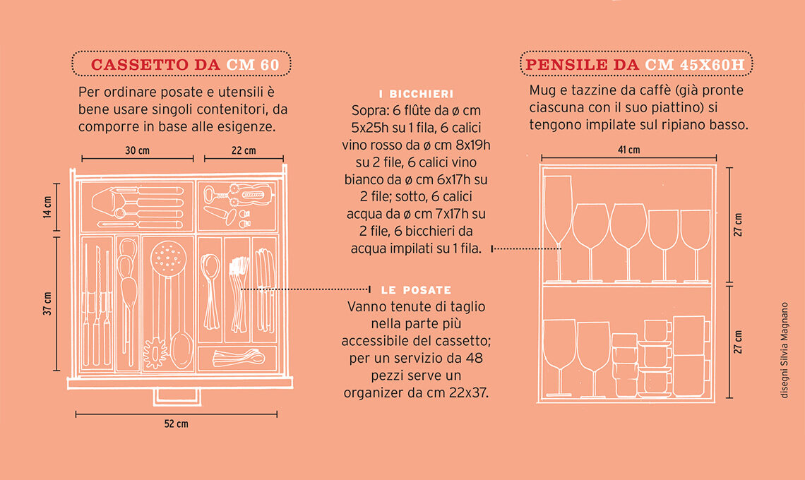 Per ordinare posate e utensili è bene usare singoli contenitori, da comporre in base alle esigenze. Le posate vanno tenute di taglio nella parte più accessibile del cassetto; per un servizio da 48 pezzi serve un organizer da cm 22x37.