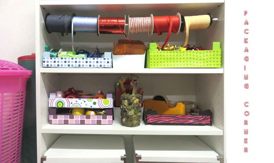 Ho sempre avuto in casa varie tipologie di carta da pacchetti, nastri, cordoncini e sacchetti per confezionare regali preparati da me o acquistati, ma tutto è sempre stato infilato negli spazi lasciati vuoti da altre cose e quando dovevo fare un pacchetto ero costretta a prendere la carta in fogli da un cassetto, quella in rotoli da un cestino nascosto dietro alla porta, il nastro da una mensola... un delirio!