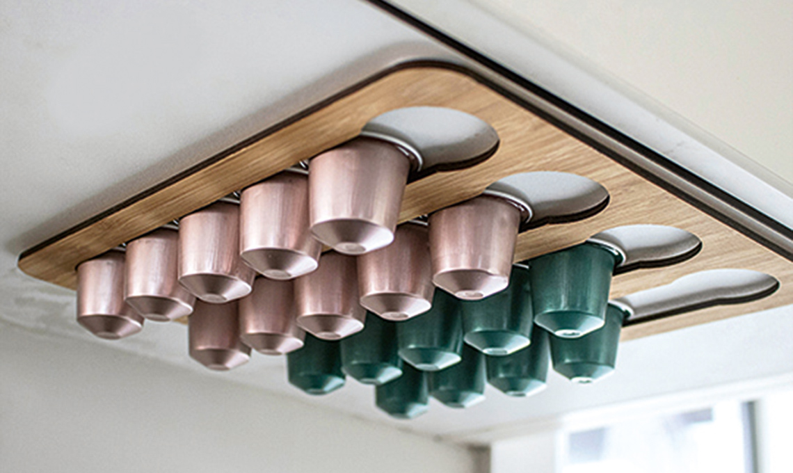 - Dispenser sottopensile per 20 capsule di caffè Nespresso, in legno compensato di bambù di Further Fabrication.