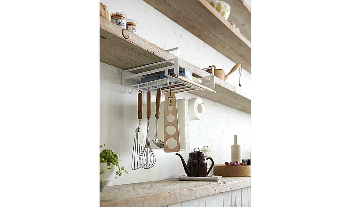 - Supporto sottomensola in acciaio e legno, con vano, ganci e barra per gli strofinacci di Yamazaki.