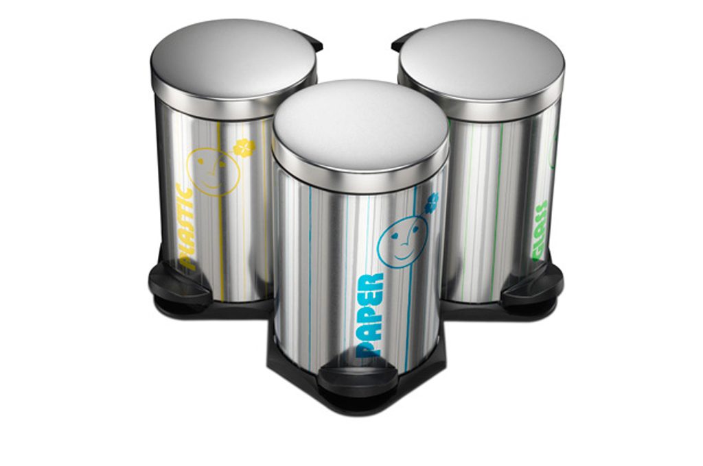 In acciaio satinato inossidabile, contiene 3 secchielli in pvc, da 15 l l'uno, e ogni scomparto ha il suo pedale di apertura [D-mail, cm 60,5x32,5x50h €69].
