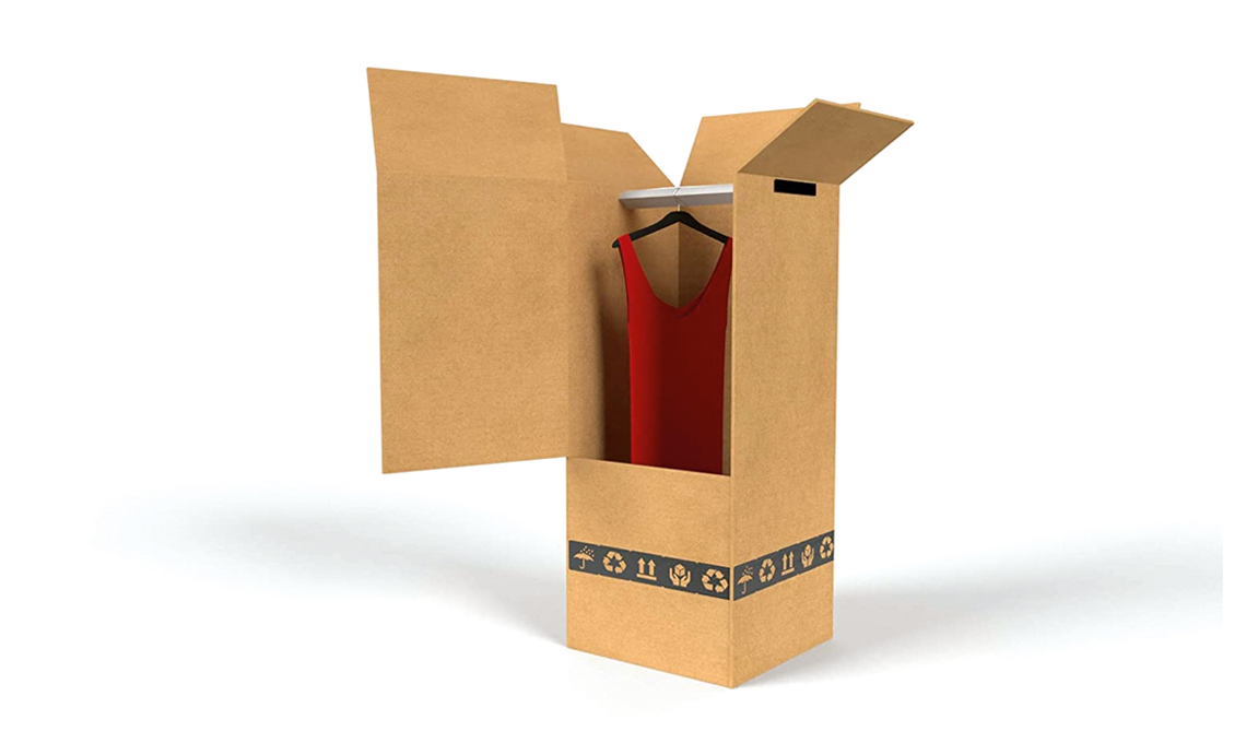 Scatola portaabiti attrezzata con barra appendiabiti all’interno. In cartone doppia onda 100% riciclato, molto resistente. Contiene fino a 35 capi [Imballaggi 2000]