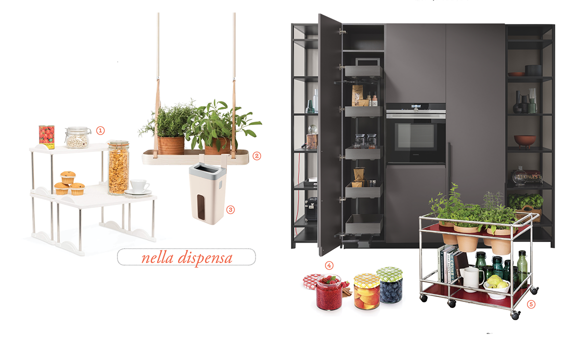 Dispensa della cucina Formalia con colonna dotata di ripiani estraibili in metallo [Scavolini]. 1 ripiani componibili per pensili [Dmail, cm 43,5x22x22h]. 2 mensola sospesa Tuokko [Verso Design, cm 58x18x75h]. 3 dispenser sacchetti Flexispace da appendere all’anta [Tescoma, cm 12x9,6x26,5h]. 4 vasi per conserve Della Casa [Tescoma, da 400 ml]. 5 carrello Haller con top con 4 fori portavasi, in acciaio verniciato e cromato [USM, cm 77x52x57,5h]