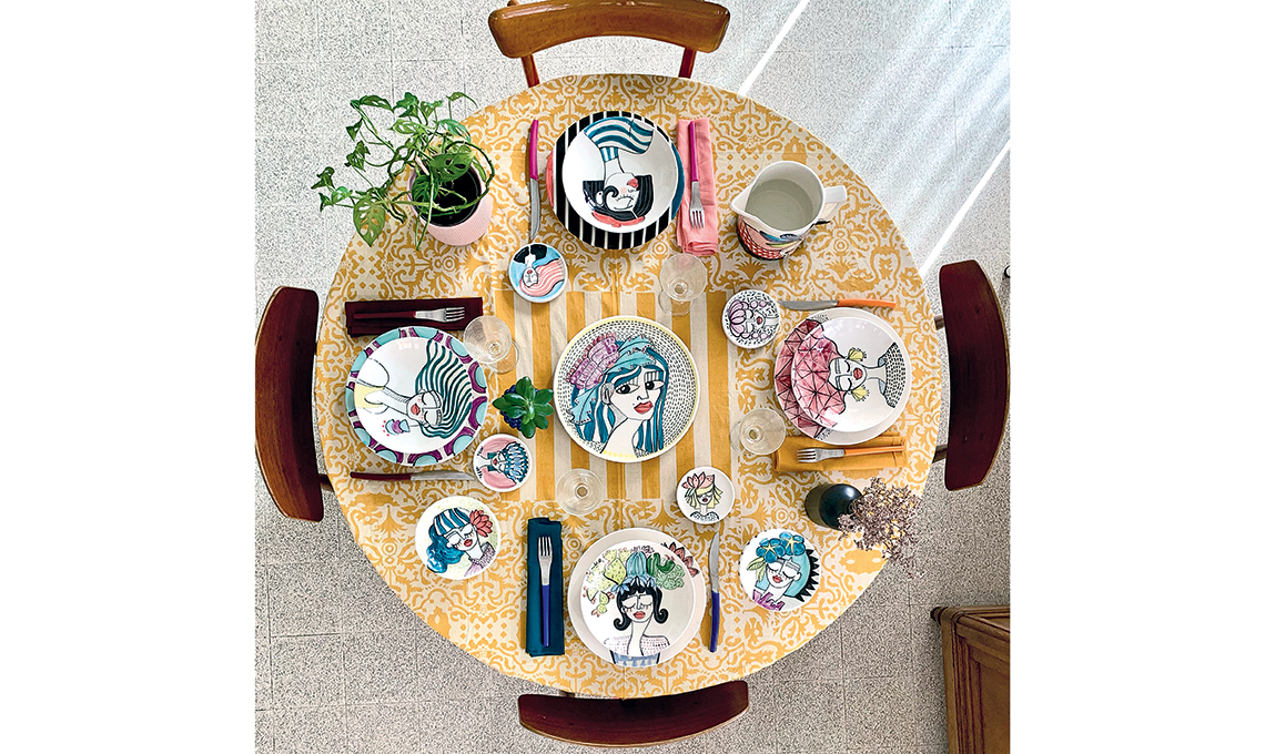 Da una personalissima passione nasce questa tavola fatta di ceramiche con volti di donna. È una mise en place colorata e dal mood esotico. Da copiare per questa estate!