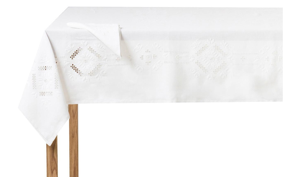 Tovaglia ricamata In lino bisso, leggero e di alta qualità, con ricamo a punto ‘sfilato siciliano’. È un pezzo appartenente al corredo di famiglia che trova su questa tavola una reinterpretazione non troppo classica. Su Etsy puoi trovarne di nuove, anche su misura, e vintage.