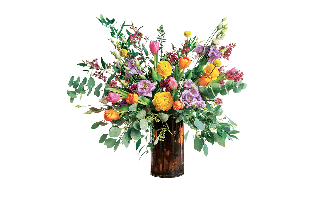 ’Festa’ di verde. La mimosa, con i suoi capolini globosi e ribelli, unita a gerbere, tulipani e viola ciocca, compone un centrotavola ’spettinato’ che straripa di foglie, corolle e tralci. E segue l’abbondanza decorativa dei piatti.