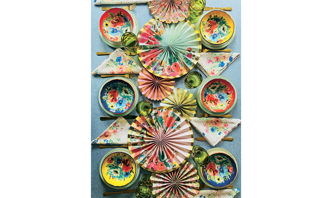 Colore. Parti da una tovaglia in tinta unita se hai piatti variopinti come nel nostro caso. Se invece hai un servizio bianco, ‘sposta’ il colore sui piatti da antipasto, sulla tovaglia, sui bicchieri e4sui ‘party fans’, i ventagli.