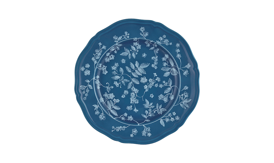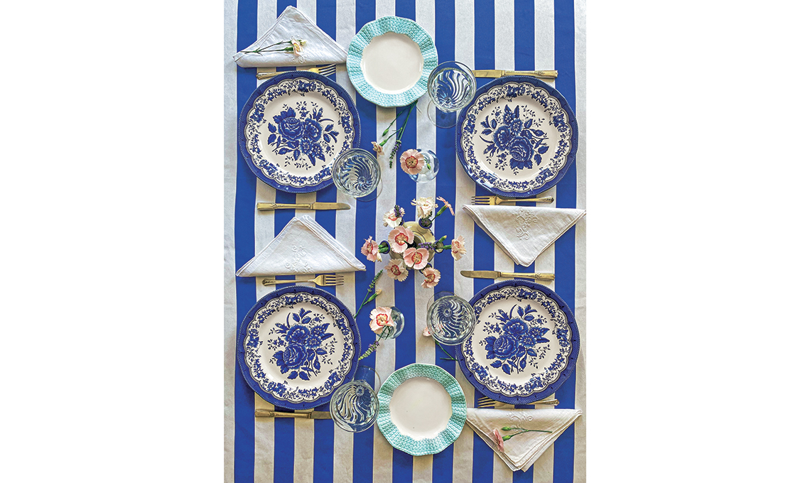 La seconda tavola, in blu, è opera della nostra lettrice Beatrice Sannino, @beatricesanninobea: «Mi sono divertita a combinare elementi vintage, come le posate di sheffield, su una tovaglia a righe blu mare». Prolungare l’atmosfera da vacanza fa bene! Piatti Tudor Royal Collection [su amazon.com].