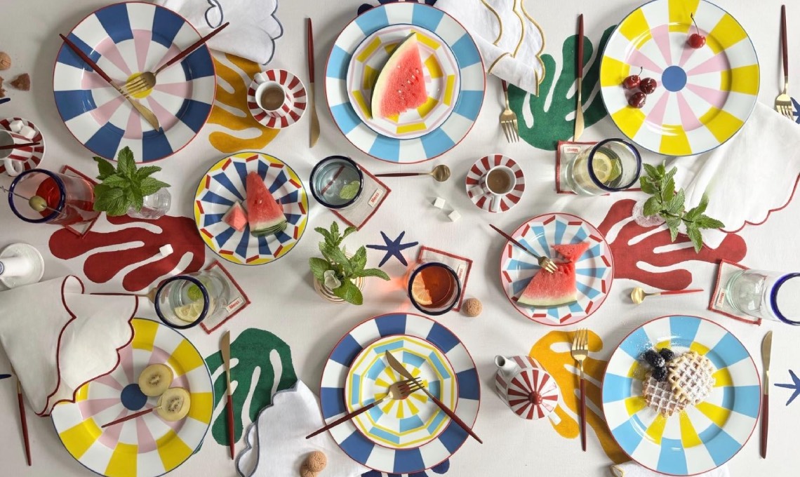 Beatrice Sannino, @beatricesanninobea su Instagram, ci racconta questa sua tavola esplosiva: «Nasce in una giornata di giugno così piovosa e grigia da sembrare novembre. Mi sono chiesta: quali sono i colori dell’estate? E quali pattern la rappresentano? Così ho iniziato a combinare forme geometriche e tinte vibranti, seguendo l’istinto più che un disegno preciso. Il risultato è stato un inno visivo alla stagione che aspettavo». Noi ci siamo divertiti a seguire il filone, incrociando righe, scacchi e diagonali!