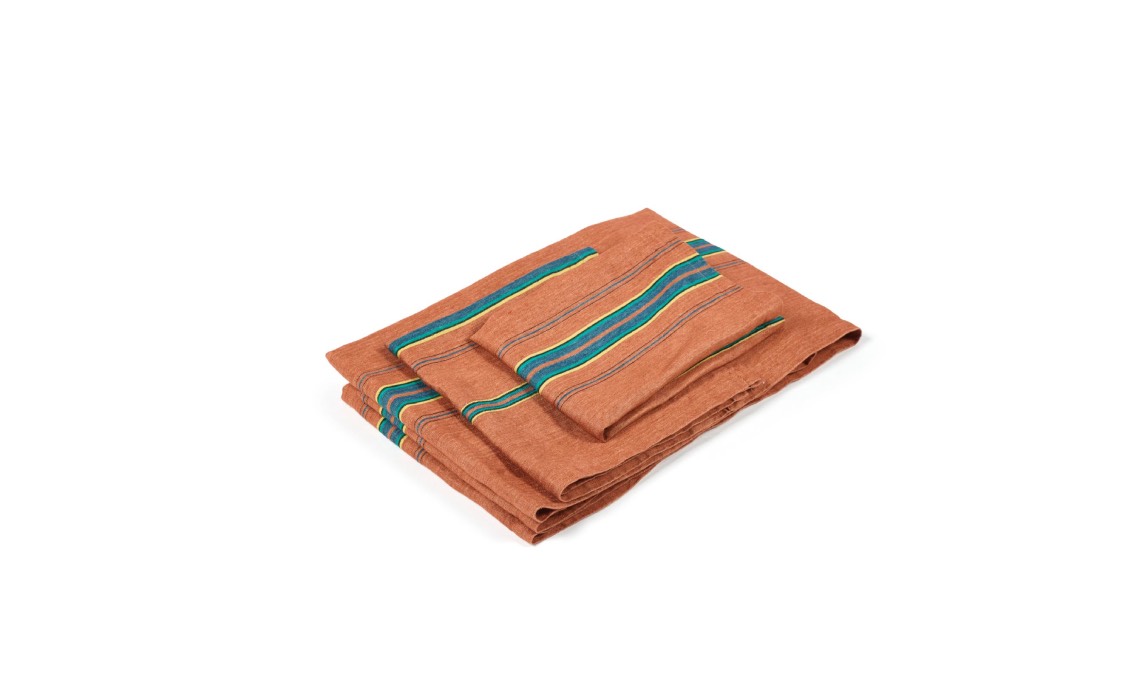 1. Tovaglia-telo La tovaglia somiglia molto a un telo da spiaggia: righe, tessuto grezzo, punto di turchese come quello del piatto piano che riporta alle acque cristalline del mare.