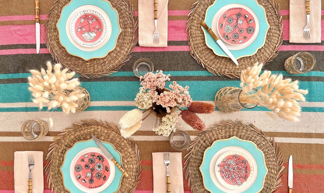 Anche questa nasce così, consumando un pranzo sotto la veranda di una casa al mare: righe che riportano alla mente sdraio, teli da spiaggia, tende leggere, lettini e cabine balneari; e materiali naturali come bambù e rafia sfrangiata. Ma il dettaglio (da rubare!) che rende tutto più estivo e iconico sono i mazzi di spighe riarsi dal sole...