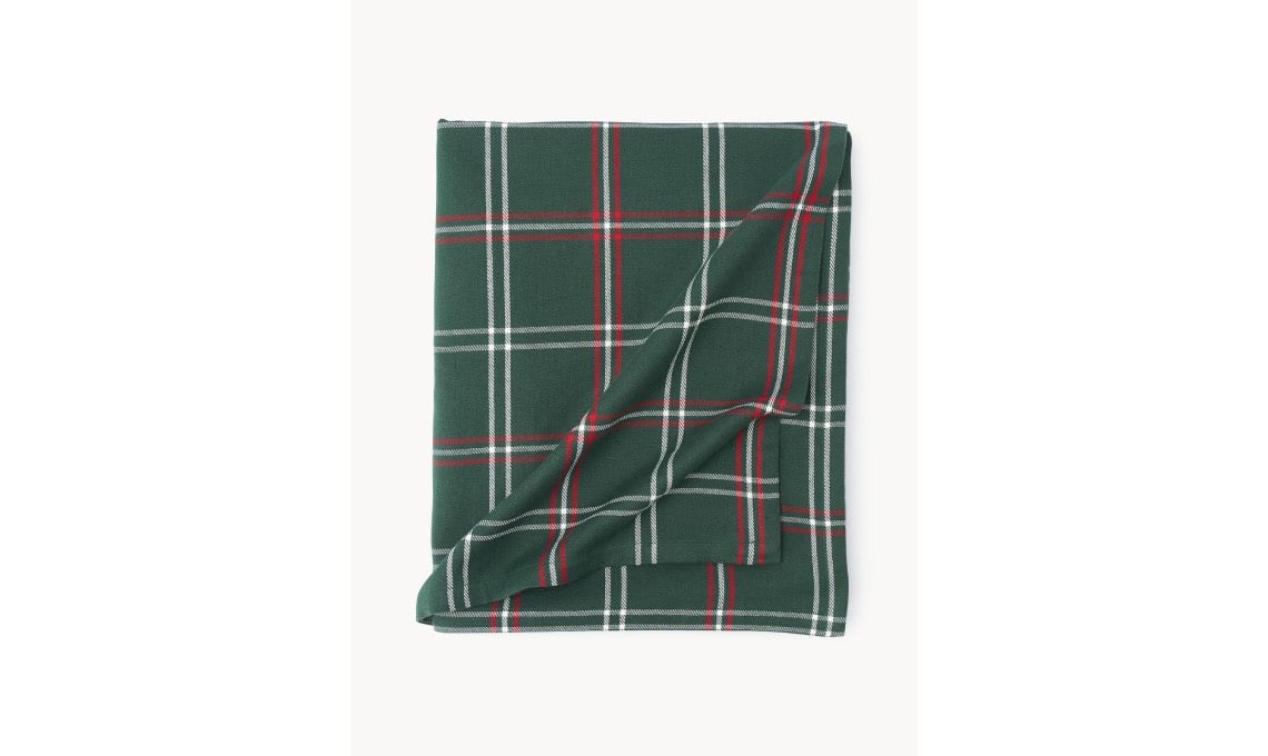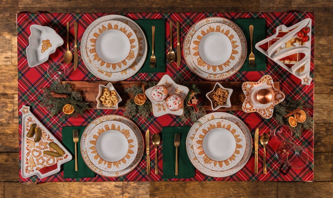 La terza è la tavola Thun, classica in tartan, con il set aperitivo con forme natalizie e piatti in porcellana Thunland.