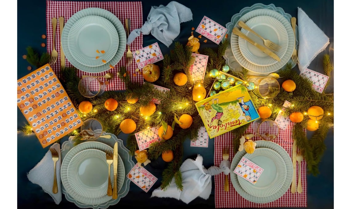 Nella seconda va in scena la tradizione della tombola. Intorno, rami di abete, lucine e mandarini, con le tovagliette segnaposto, perfette nel caso in cui non si abbia il classico servizio coordinato per tutti gli ospiti. Sono il tocco inatteso che dà brio alla tavola. Ci siamo ispirati alla tavola di Serena Villa Alicata @e_tantifioridililla: «Ho scelto di usare tovagliette diverse – in realtà quelle a quadri sono tovaglioli – perché le tavole di Capodanno di solito accolgono molte persone e non sempre si dispone di un coordinato completo. Se poi si vuole dare ancora più atmosfera al centrotavola, basta aggiungere delle candele per tutta la lunghezza». Piatti [Ikea], posate [Pozzi Milano], bicchieri con bordo ora [Kasanova], tovaglia [Action].