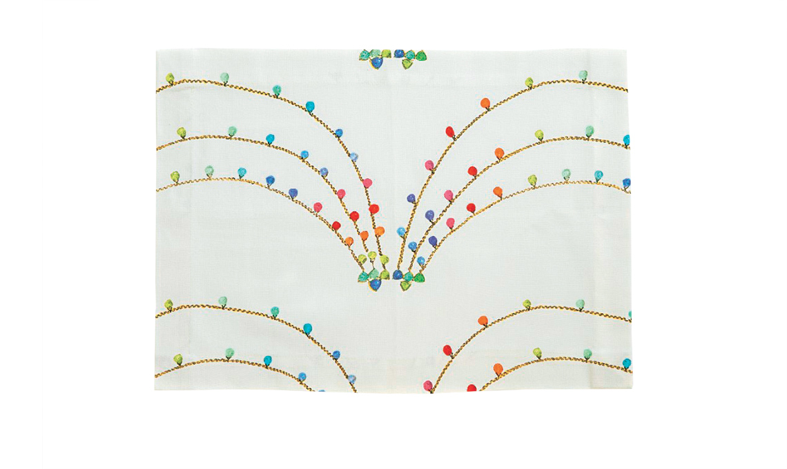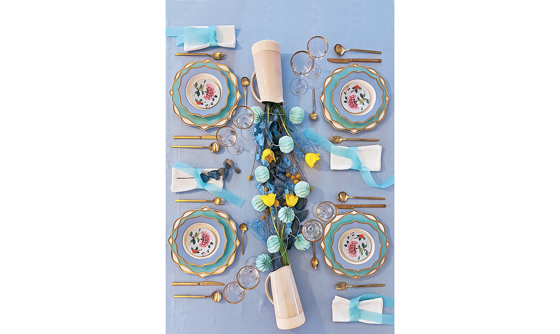 Nastrini in voile fermano i tovaglioli e si accodano alla ghirlanda color Tiffany: quest’ultimo è un azzurro o un verde acqua? Sulla questione si innesta un acceso dibattito: se il grande pubblico lo associa a una sfumatura di verde, l’omonimo brand parla di Blue Tiffany, standardizzato anche da Pantone con il numero 1837, in onore della data di fondazione della Maison.
