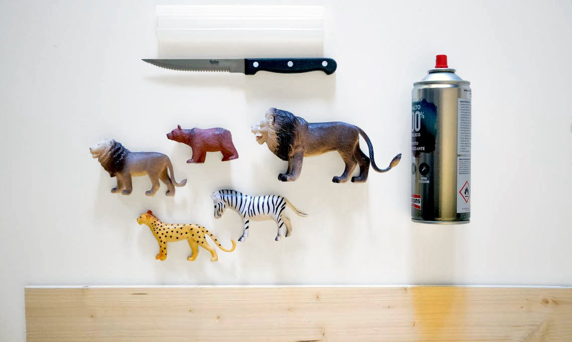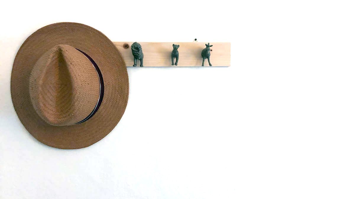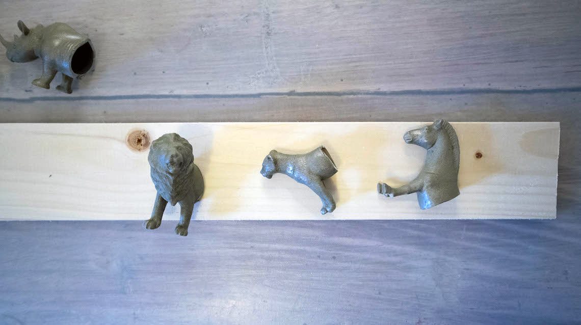 - Colora con una o più mani di vernice spray gli animali. Mentre aspetti che gli animali si asciughino, applica i ganci da quadro sul listello di legno.