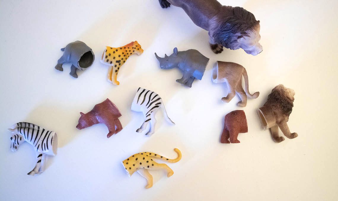 - Inizia segando a metà gli animali. Io ho utilizzato un semplice coltello da cucina con lama seghettata ma, a seconda della durezza del materiale, potrebbe servirti un seghetto;