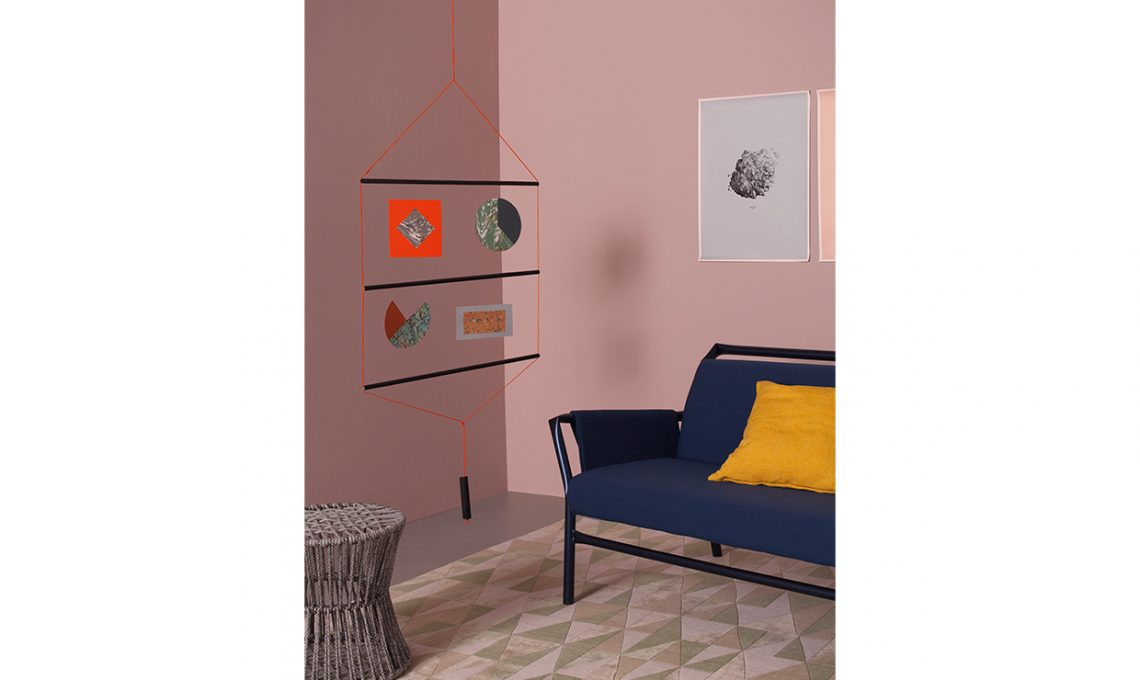 Sul divanetto Superkink [Enginux, cm 163 da €3.196], cuscino [Coincasa €29,90]; tappeto Diamond Soie Sage in seta e lana himalayana [cc-tapis, cm 230x300 €7.492], tavolino Ziggy [Saba Italia, Ø cm 44x40h €360], stampa Nature1: Hailstone by Form Us with Love [Paper Collective, cm 50x70 €45, di cui il 15% va al WWF].