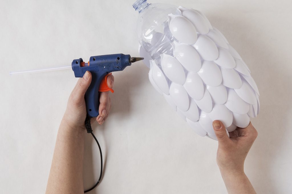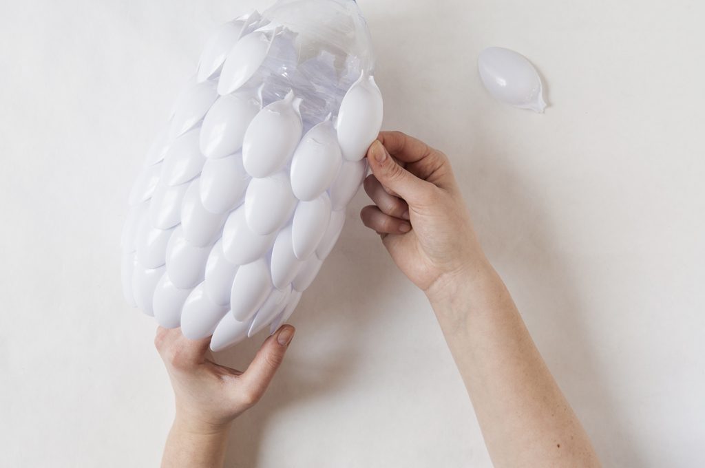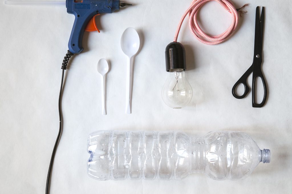 Cosa ti serve: pistola per colla a caldo, 10 cucchiaini e 60 cucchiai in plastica, lampadina fluorescente (con attacco e cavo), forbici, una bottiglia di plastica.