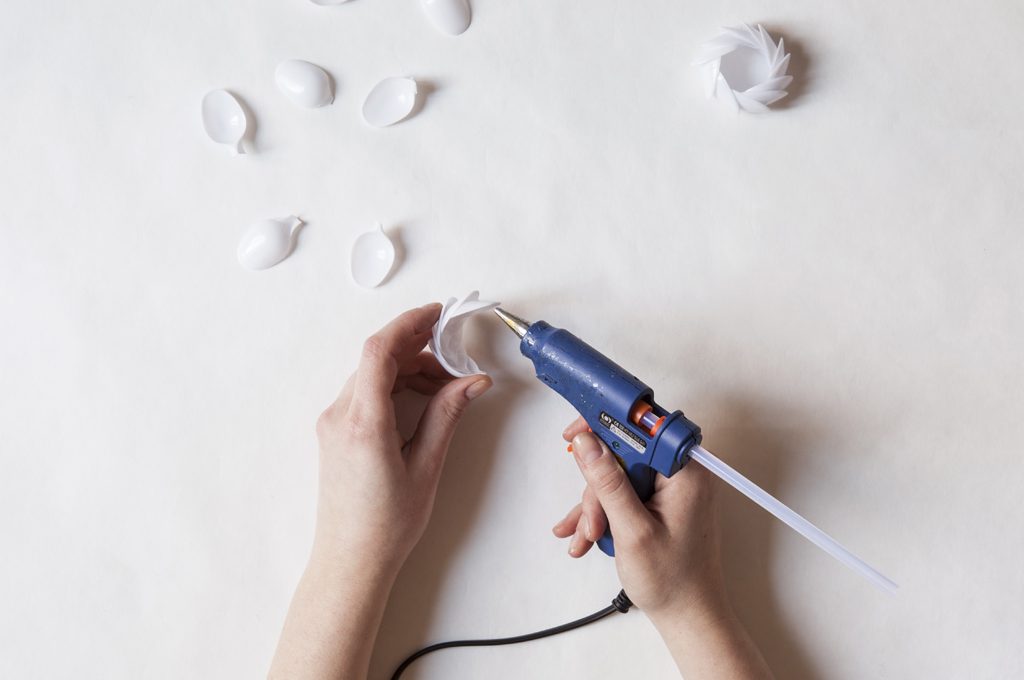 Con la pistola a caldo, incolla le palette con il lato convesso all’esterno. Uniscile, una per volta, in modo che sormontino la precedente per metà superficie, in verticale. Avrai la coroncina, in alto a des., poco più grande del collo di bottiglia.