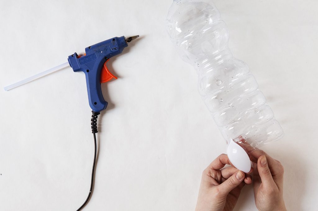 Taglia il fondo della bottiglia, in modo che sia tutto aperto. Poi, come hai fatto con i cucchiaini, separa le palette dei cucchiai grandi dai manici; inizia a incollarle dal basso della bottiglia, procedendo in circolo.