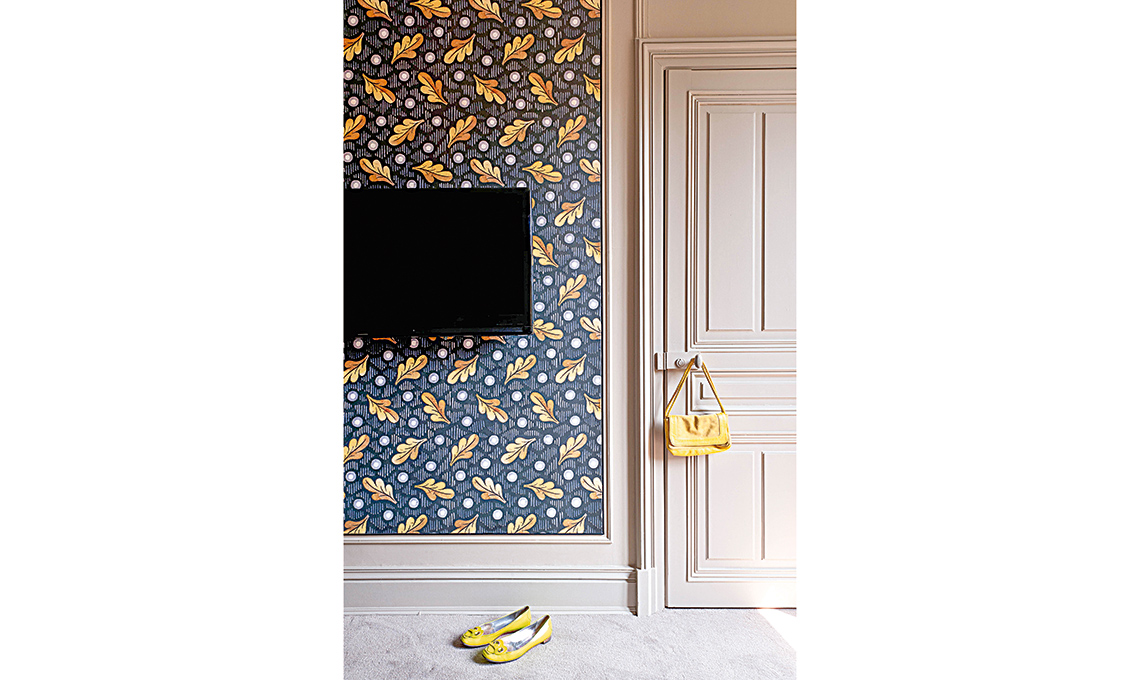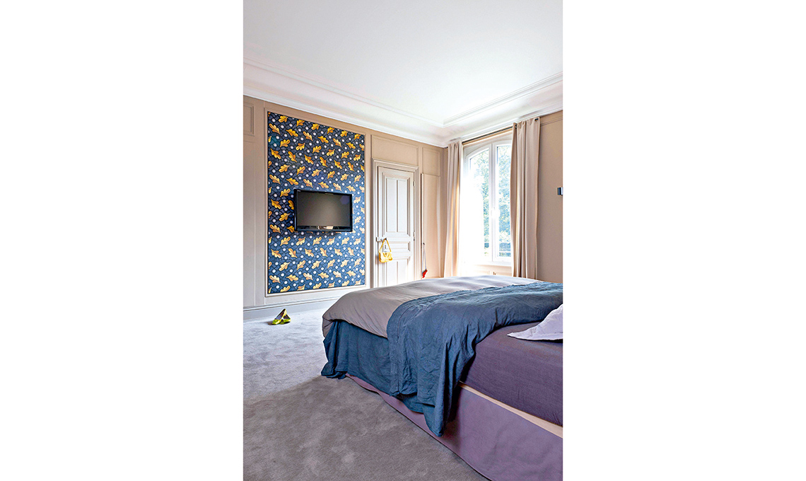 Incornicia la carta da parati decorativa con le modanature dipinte come la parete e al centro fissa la tv con le staffe, come se fosse un quadro! Ecco come procedere: