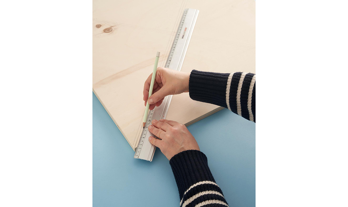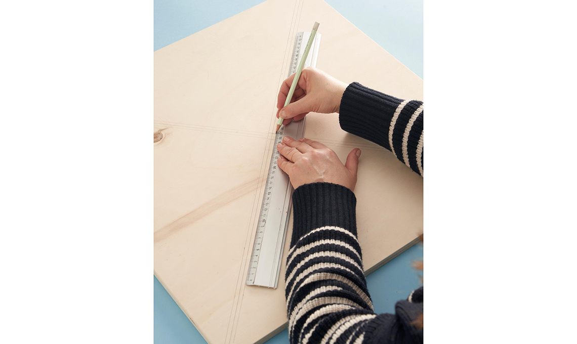 1. Traccia sul compensato le diagonali, quindi due righe parallele a mm 5 (a destra e a sinistra) rispetto alle diagonali.