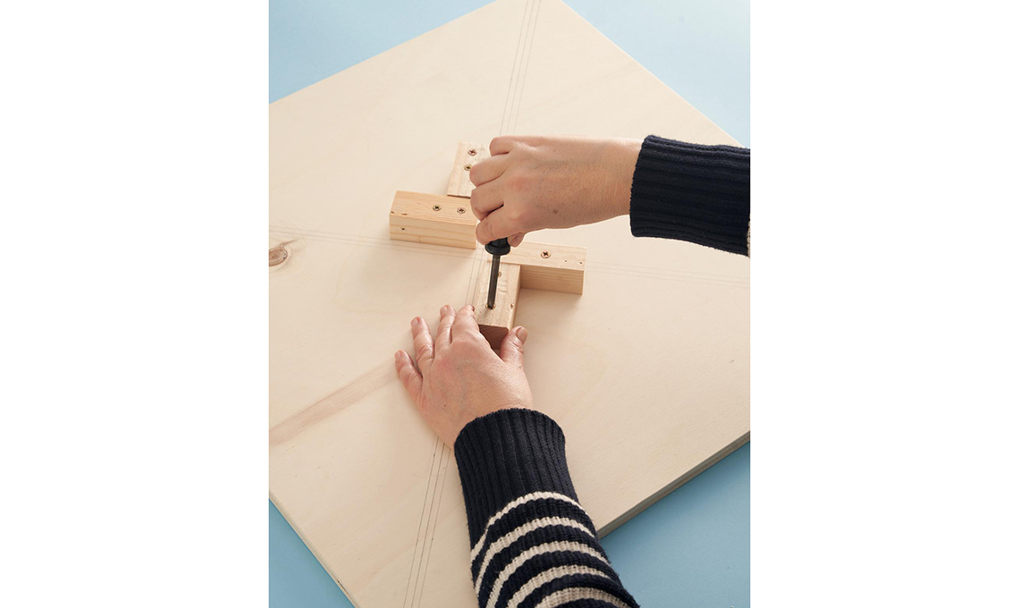 3. Posiziona a coppie – a L e specchiati – i blocchetti di legno sul quadrato e avvitali.