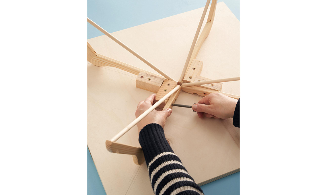 6. Posiziona le grucce con il lato forato sul centro del tavolino. Appoggiale al blocchetto di legno sui riferimenti a matita e avvitale.