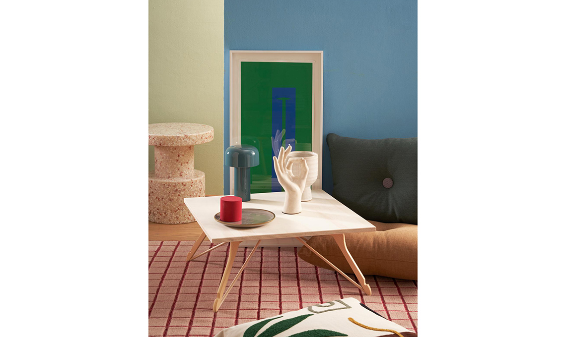 Serigrafia di Bruno Munari [Galleria L’Affiche], sgabello Bit Stool di Normann Copenhagen [da Arcarreda], cuscini Ferm Living e Hay [da Design Republic], tappeto Shallow Squares [I+I Collection]. Sul tavolino: lampada Bellhop [Flos], mano decorativa [Palermo Uno], vaso [da Arcarreda].