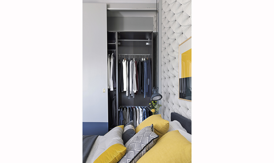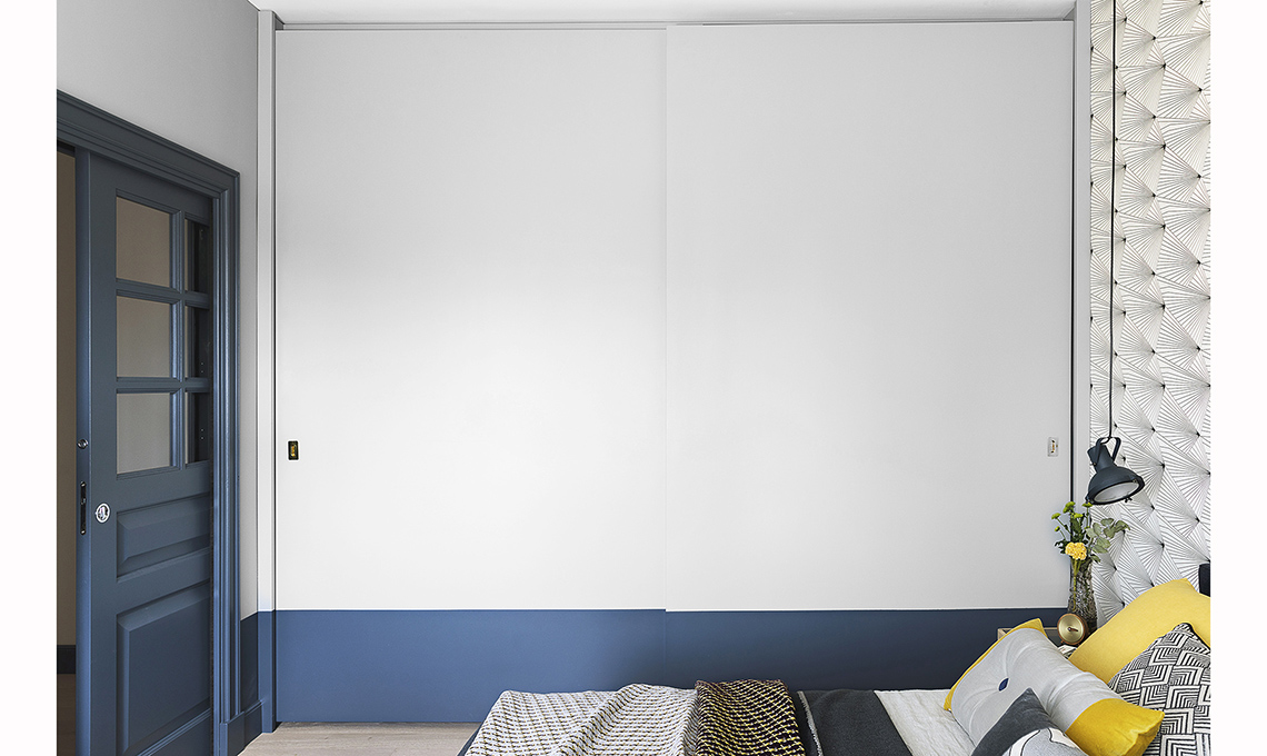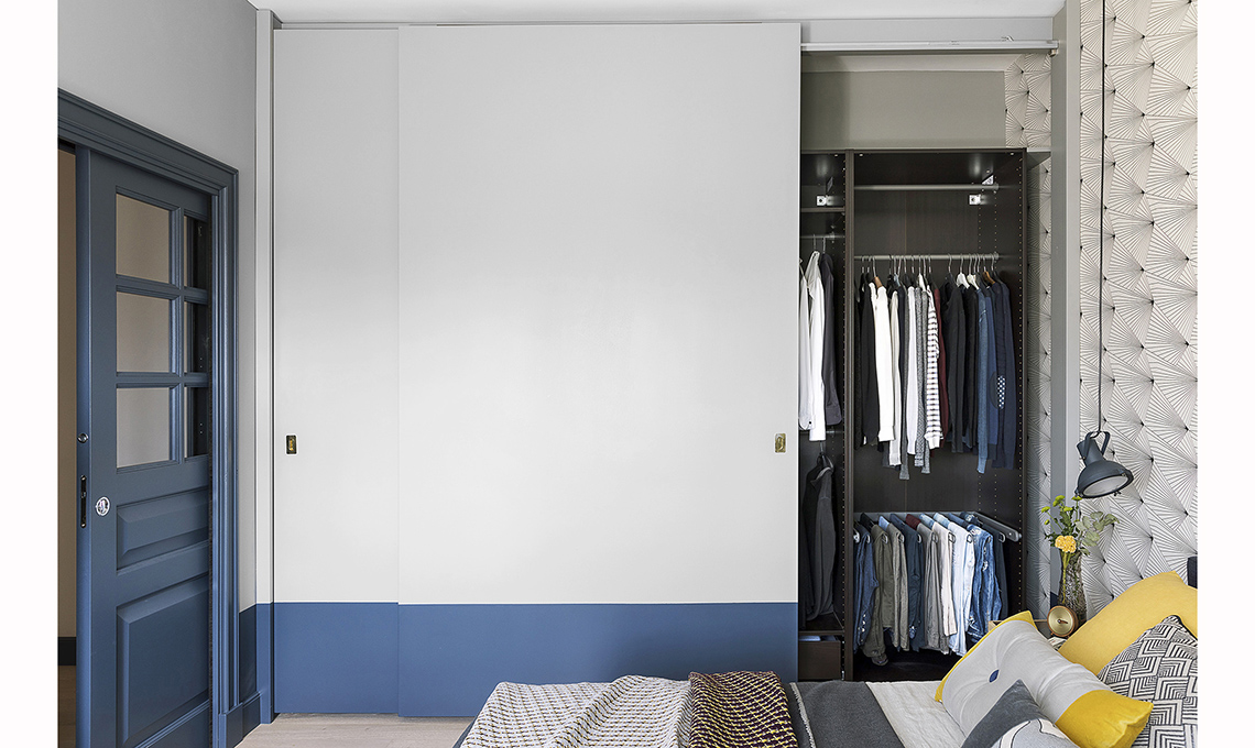Una soluzione esteticamente accattivante che si integra al meglio con la stanza, grazie anche alla boiserie dipinta sulle ante, che prosegue quella delle pareti. Si utilizza così lo spazio, di solito a vista e disordinato, sopra gli armadi.