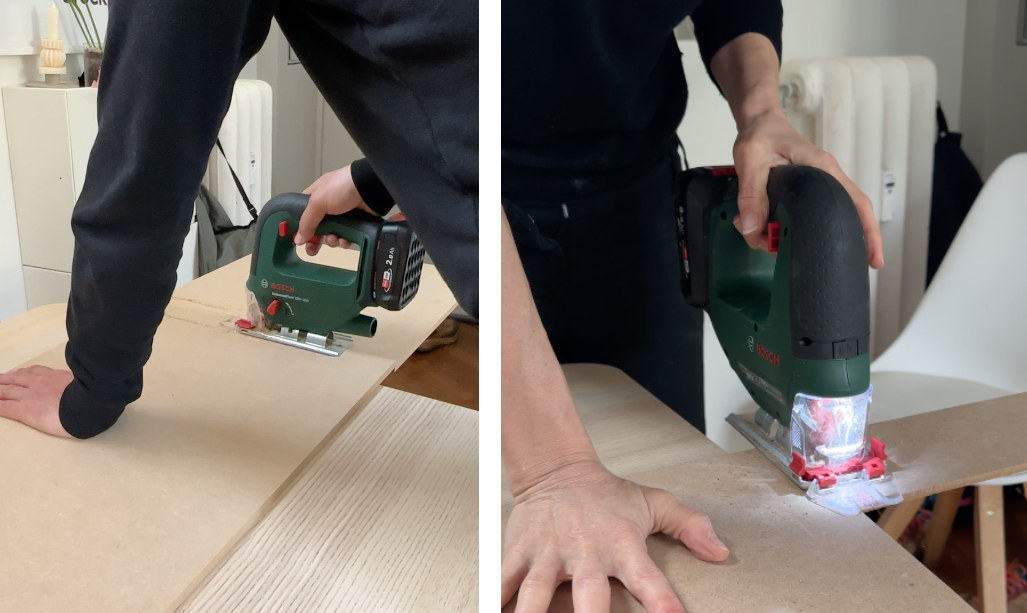 - Prendi le misure della libreria e come prima cosa, taglia i pannelli di OSB in base all'altezza definitiva della libreria con il seghetto elettrico. Per la mia libreria ho usato pannelli OSB con spessore 1,5 cm. Rifinisci con la carta vetrata.