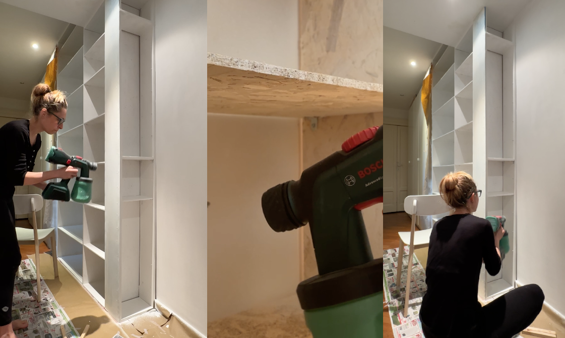 - Quando la libreria sarà montata procedi con la finitura. Dai prima una mano di primer e poi passa al colore. Per stendere lo smalto, puoi usare il pennello, un piccolo rullo o ancora meglio, una pistola a spruzzo, per un lavoro più preciso.