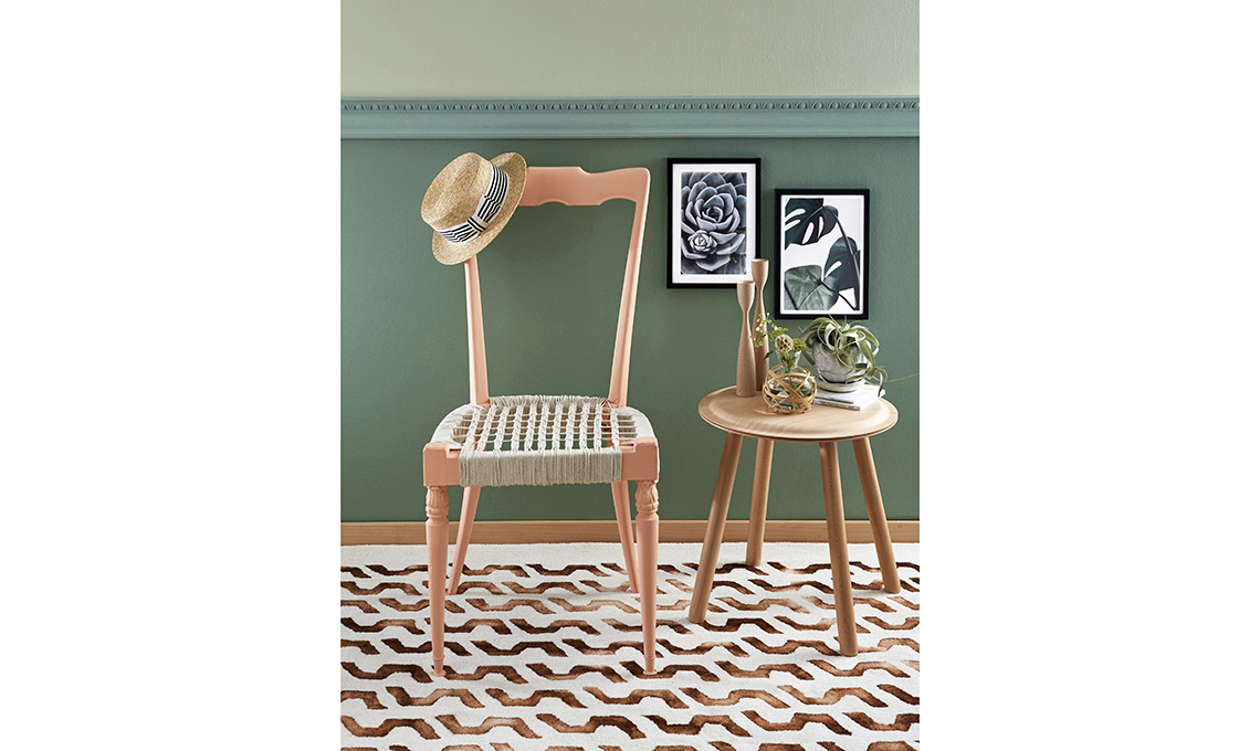 - La sedia di recupero senza seduta diventa ‘telaio’ per la tessitura a macramé. Avvolgi il cordoncino con giri fitti attorno alla seduta e fissalo sul retro con la colla a caldo.